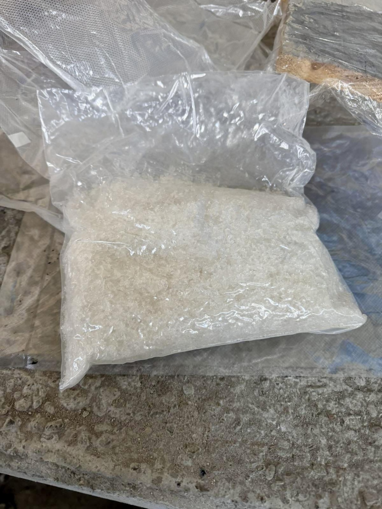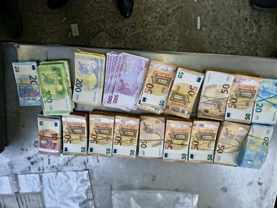 В условията на неотложност е било извършено претърсване и изземване, при което са намерени и иззети прозрачен полиетиленов плик, съдържащ бяло кристално вещество с тегло около 985 грама. При направения полеви наркотест то е реагирало на наркотично вещество – метамфетамин. Иззета е парична сума в размер на 84 500 евро и лекия автомобил.