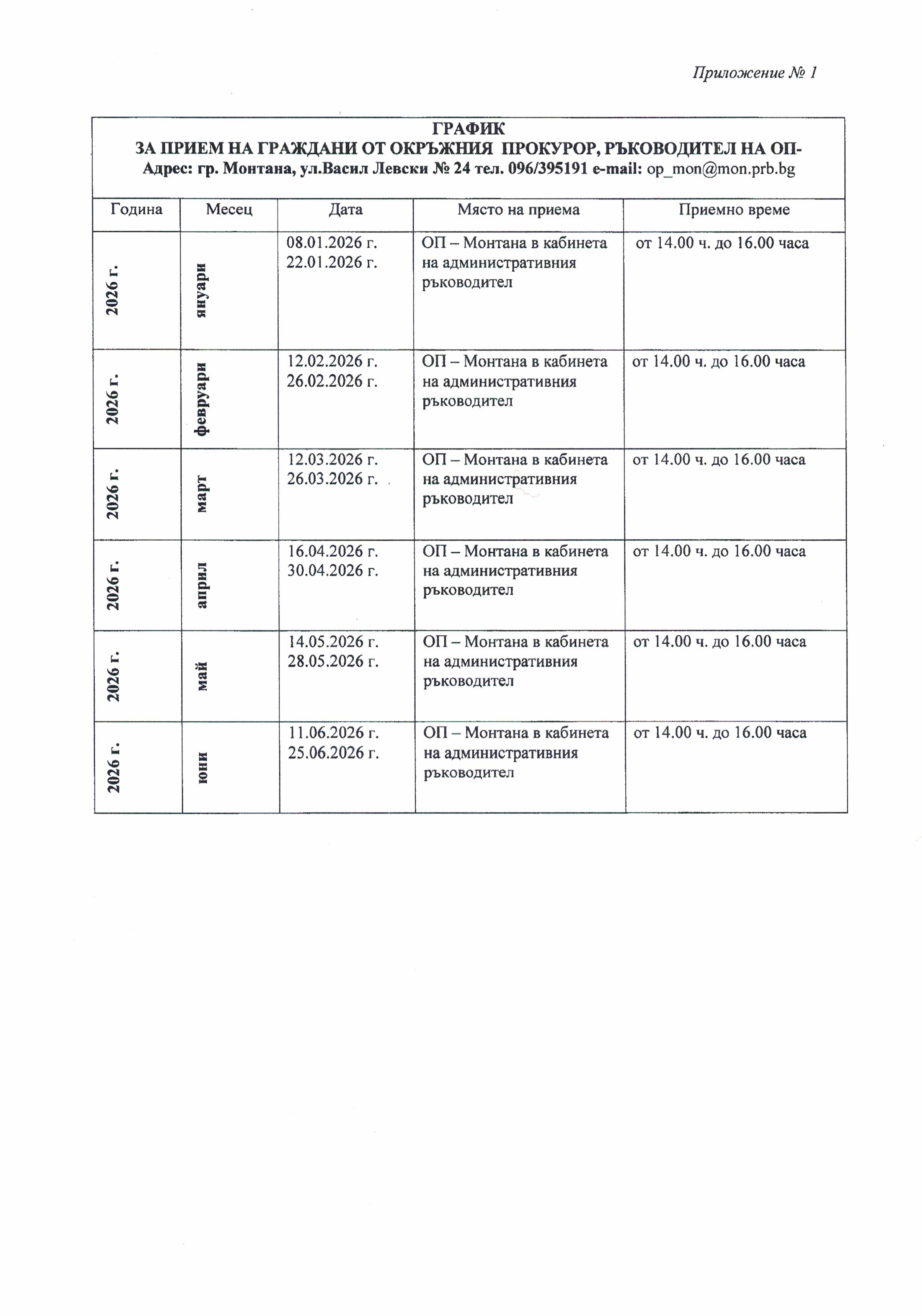 Времето за прием се обявява на видно място на входа на Приемната и се публикува на интернет страницата на Прокуратурата на Република България. Предварителна заявка за прием може да се прави на посочените телефонен номер 02/800 56 36, и електронен адрес (поща): [email protected].