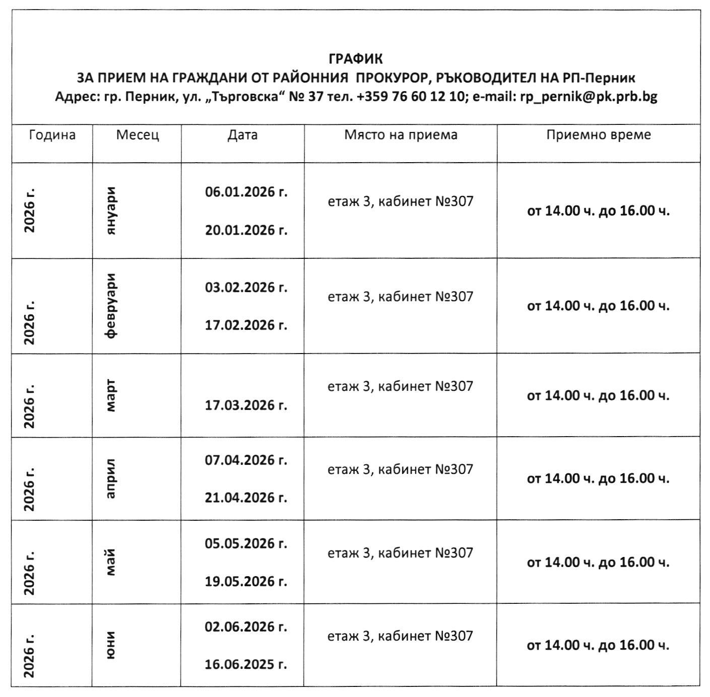 График за прием на граждани в РП Перник за първото полугодие на 2026г.